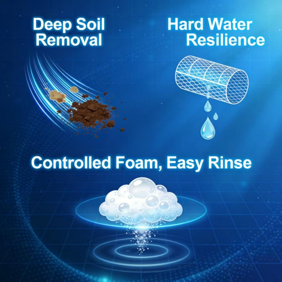 Resiliencia al agua dura:A diferencia de los jabones tradicionales, resiste la formación de espuma insoluble en agua dura (alto Ca²⁺/Mg²⁺), evitando la pérdida de poder de limpieza y la sensación sucia y rígida de la ropa, asegurando un rendimiento constante.