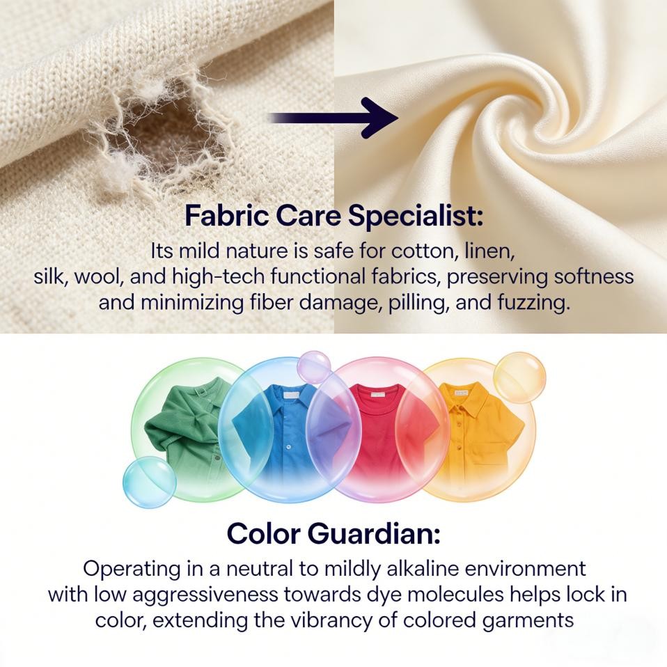 Especialista en cuidado de telas:Su naturaleza suave es segura para el algodón, el lino, la seda, la lana y los tejidos funcionales de alta tecnología, preservando la suavidad y minimizando el daño a las fibras, la formación de bolitas y la formación de pelusas.