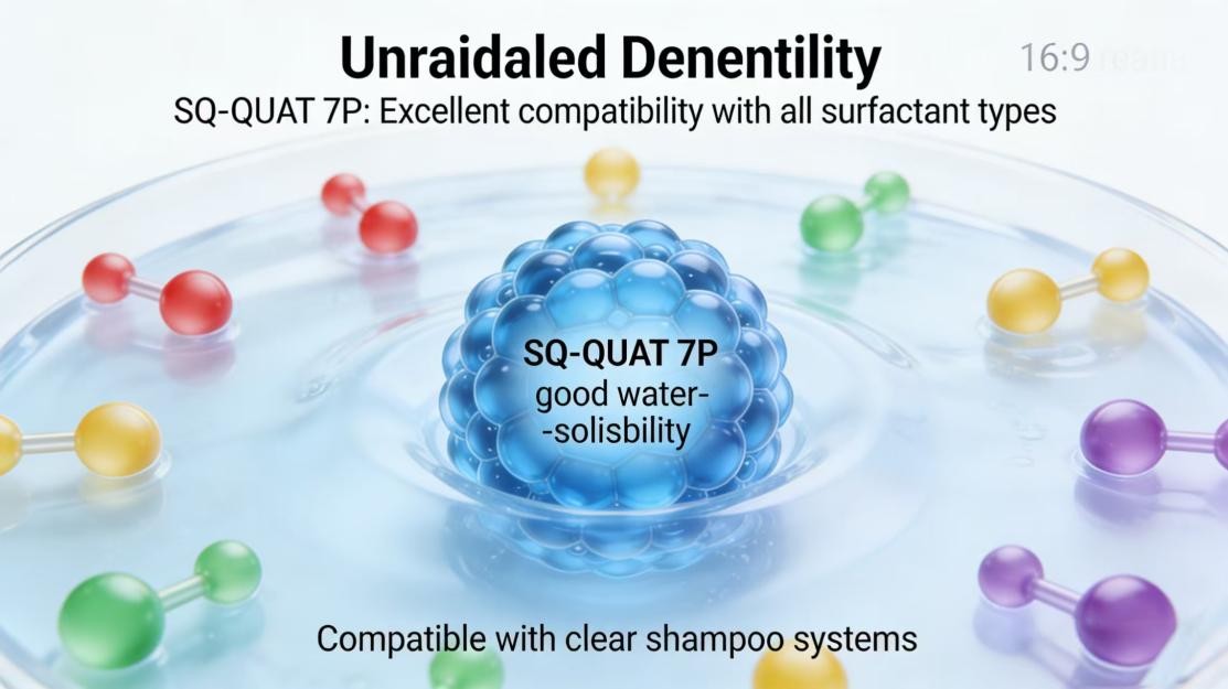 En sistemas de champú complejos, la "coexistencia armoniosa" de ingredientes es clave para el éxito de la formulación. SQ-QUAT 7P posee buena solubilidad en agua y es altamente compatible con tensioactivos aniónicos, catiónicos, no iónicos y anfóteros. Esto ofrece a los ingenieros de formulación una gran flexibilidad, lo que permite incorporarlo fácilmente a cualquier sistema (ya sea una emulsión transparente o nacarada) sin preocuparse por la estabilidad o la pérdida de eficacia, lo que garantiza una textura estable y un rendimiento excelente en el producto final.