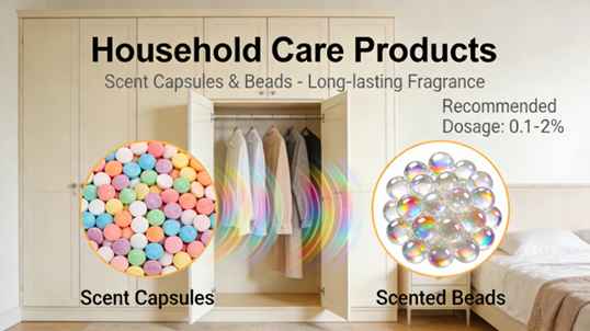 Basándose en esta tecnología de vanguardia, han surgido varios productos de fragancias de alta eficiencia: Scented Beads y Scent Booster logran una fragancia duradera después del lavado a través de microcápsulas portadoras; Las cápsulas aromáticas y la fragancia para ropa duplican el efecto de fragancia del detergente para ropa y del suavizante; El eliminador de olores y el neutralizador de olores descomponen eficientemente las moléculas olorosas en los hogares y la ropa mediante la liberación precisa de los componentes de la fragancia, en lugar de simplemente cubrirlos; Fabric Refresher, que se basa en la tecnología de microencapsulación, permite que telas grandes, como cortinas y sofás, emitan fragancias frescas durante mucho tiempo.